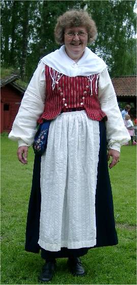 Kvinnan på bilden har vitt förkläde i tuskaft och myggtjäll med vitt